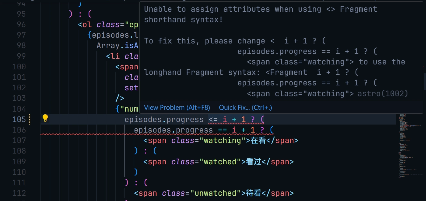 不过,Astro 自己语法的 compiler 有点问题,<= 被 tokenize 成了 <Fragment> 标记。